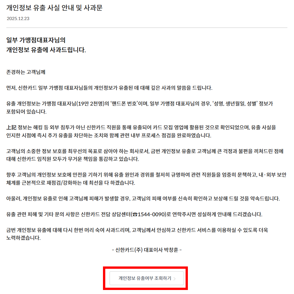 - 유출 정보: 성명, 휴대전화 번호, 생년월일 등 (금융 민감 정보 제외)