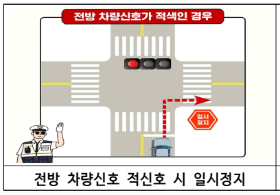 - ✅ 전방 신호가 빨간불일 때: 횡단보도에 사람이 없어도 무조건 정지선에서 완전히 일시정지