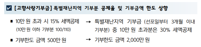 또한 고향사랑기부금 한도가 2,000만 원으로 늘어났으며, 특별재난지역 기부 시에는 공제율이 30%로 상향되어 지역 사회 공헌과 절세를 동시에 챙길 수 있습니다.