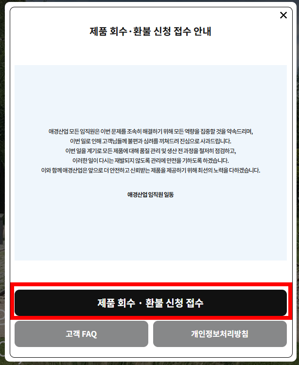 애경산업은 소비자 불편을 최소화하기 위해 매우 파격적인 환불 정책을 시행하고 있습니다. 영수증이 없어도 걱정하지 마세요.